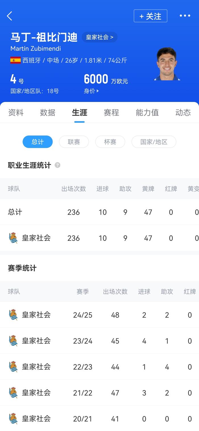 祖比门迪是皇家社会青训出身,场上主要司职后腰,截至目前共为皇家社会一线队出场236次,打入10球9助攻。